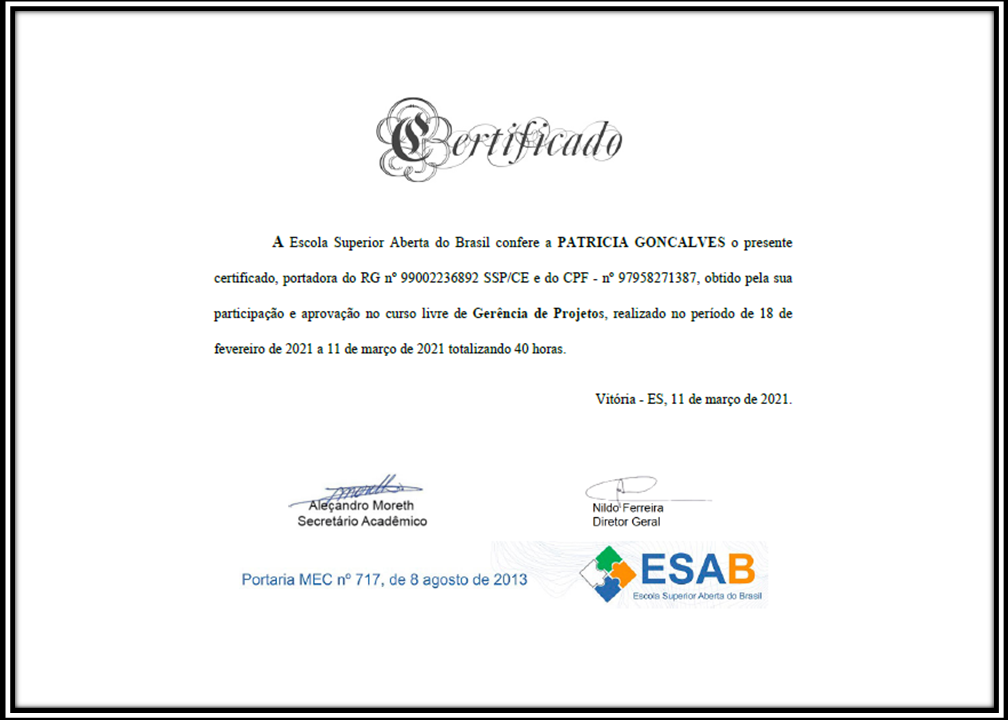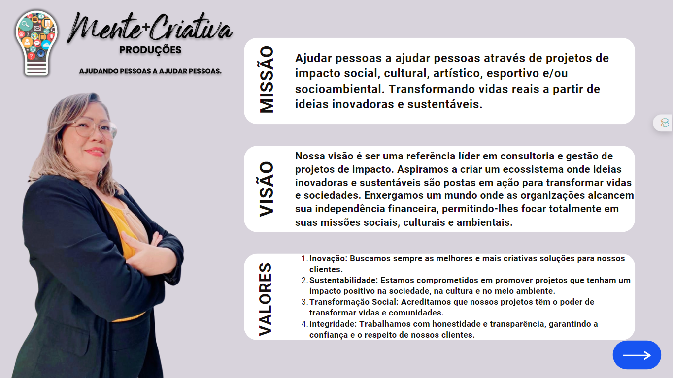 Turismóloga, Gestora de Projetos, Captadora de Recursos, Pesquisadora, Produtora e Gestora Cultural. Fundadora e CEO da Mente+Criativa Produções, Negócios e Projetos Sustentáveis LTDA. Pós-Graduanda em Política e Gestão Cultural pela Universidade Federal do Recôncavo da Bahia-UFRB_2028.1. MBA em Gestão de Projetos pela Escola Superior de Planejamento e Gestão-UNIESPG_2025.1. Graduada em Turismo e Hotelaria pela Universidade Estadual Vale do Acaraú-UVA_2010.> Especialista em Elaboração-escrita, Análise, Adequação, Adaptação, Gestão Estratégica e Prestação de Contas de Projetos de Impacto Sociais, Culturais, Esportivos, Socioambientais e Empreendedorismo Criativo.