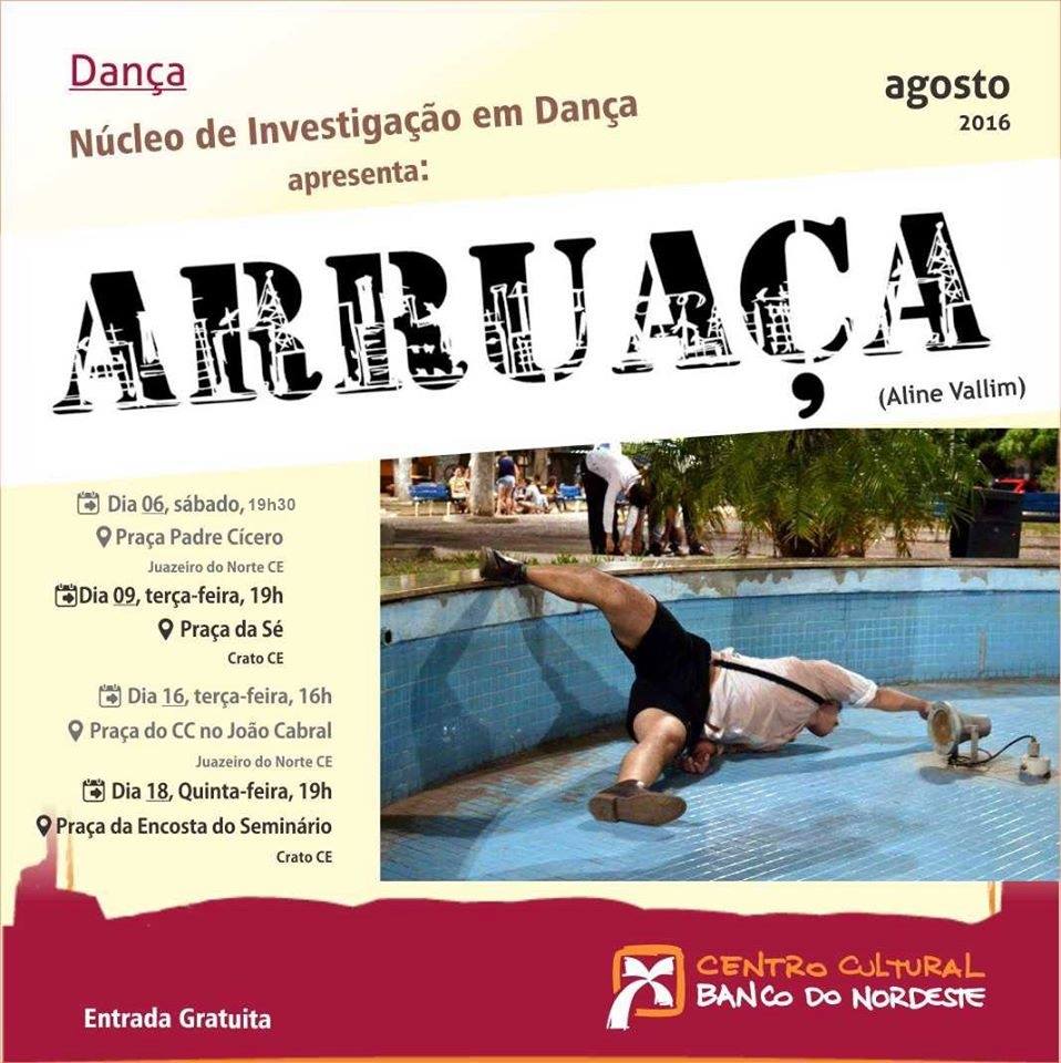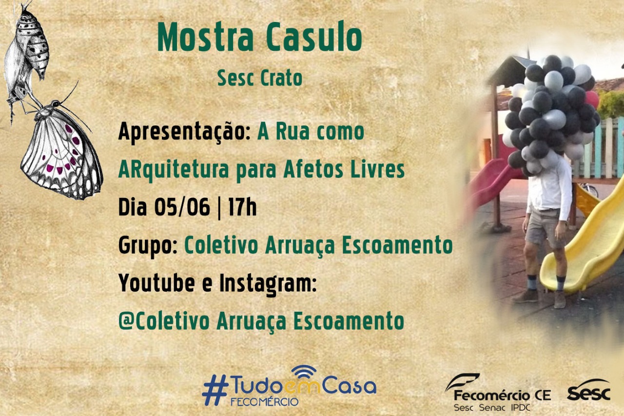 O Coletivo Arruaça Escoamento (2016), investiga experiências no híbrido de linguagens (performance, teatro, dança, artes visuais, audiovisual, música) a partir da relação entre corpo, cidade e os múltiplos aspectos de composição dessa relação. Reúne pessoas vindas de diferentes contextos e aposta numa linguagem que se delineia a partir do encontro com o fluxo de pessoas e acontecimentos que compõem a dramaturgia dos espaços - numa relação expandida - fazendo de cada ocupação um encontro, um acidente que pode nos permitir vivenciar outros olhares e reflexões para o que vem acontecendo em diversas situações cotidianas, voltando o olhar para pensar novos arranjos dramatúrgicos a partir da vivência de seus integrantes para a cultura e região do Cariri.
