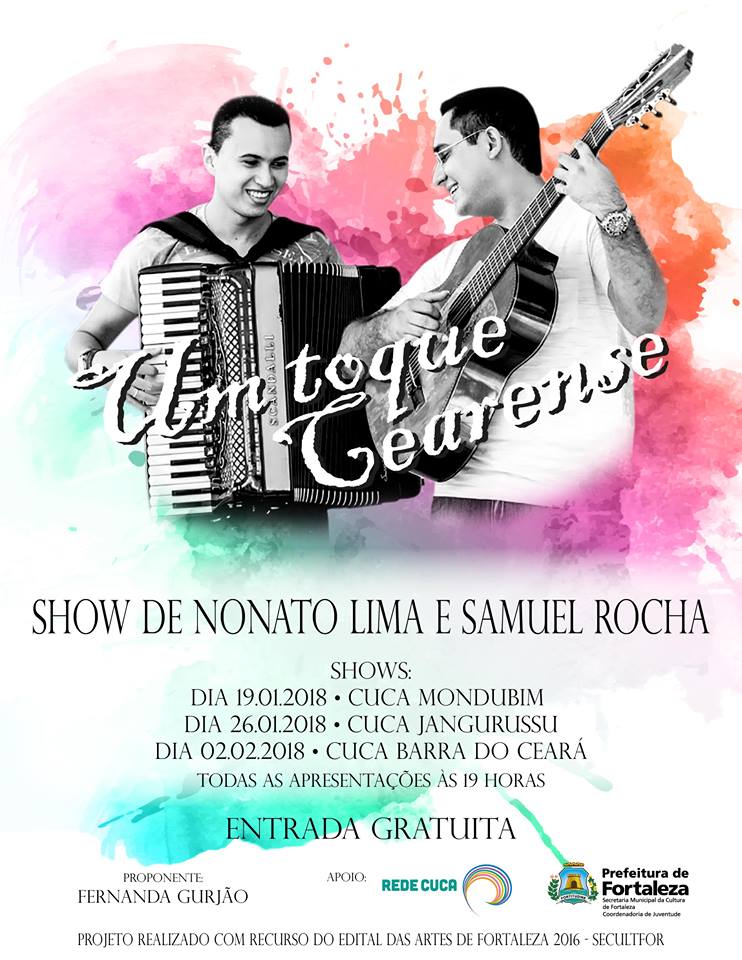 Assina elaboração de projeto e produção executiva do show (duo instrumental) “Um toque cearense”- do violonista Samuel Rocha e acordeonista Nonato Lima. Através desse projeto, Nonato Lima e Samuel Rocha realizaram apresentações na Casa do choro (Rio de Janeiro, 2015), SESC da cidade de Sobral-CE (2016), No Centro Cultural Dragão do Mar (Fortaleza, 2017), estiveram circulação pelos Centros Urbanos de Cultura, Arte, Ciência e Esporte de Fortaleza -REDE CUCA- (Janeiro/Fevereiro de 2018), com recurso do Edital das Artes da Secretaria da Cultura de Fortaleza – SECULTFOR, entre outras;